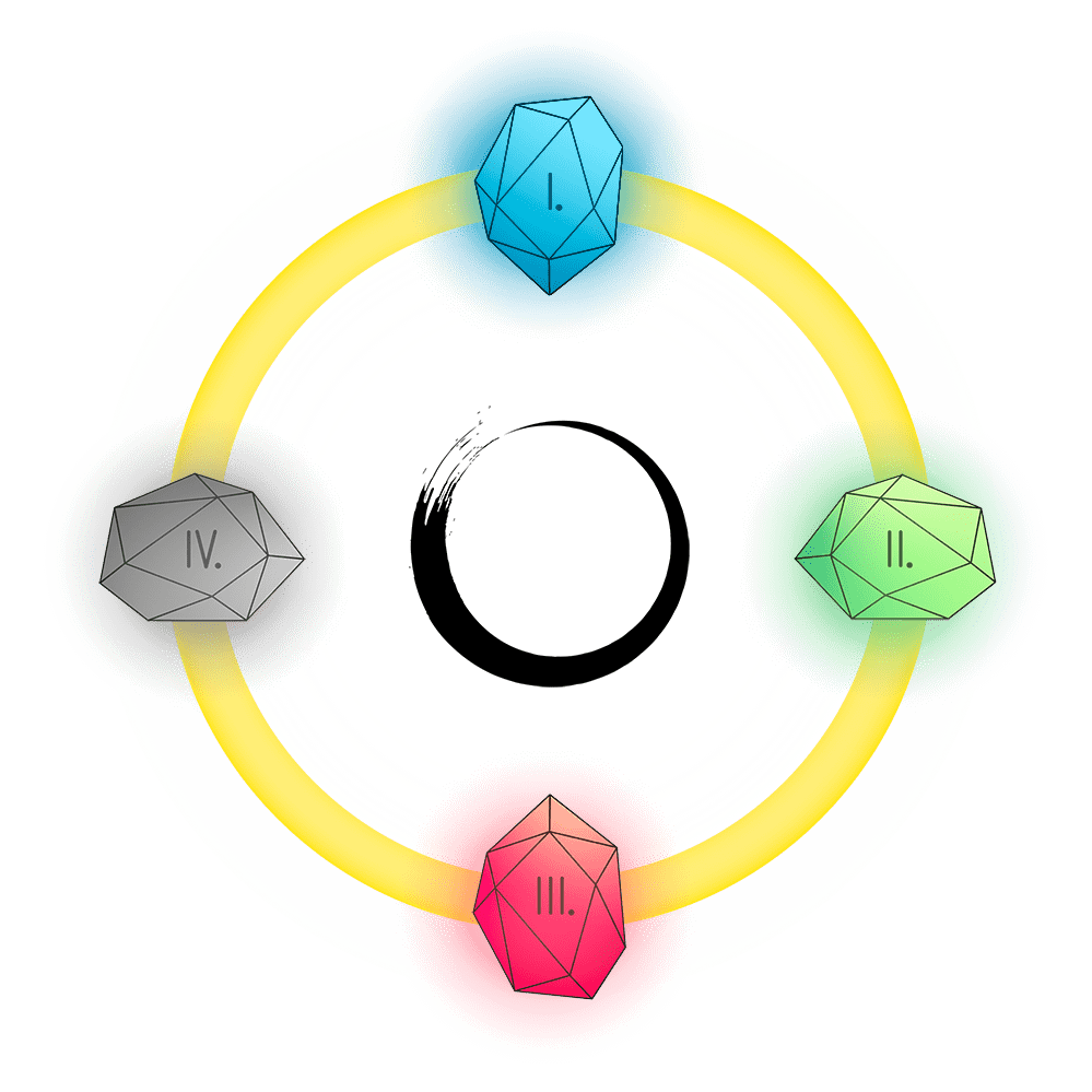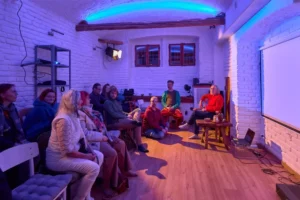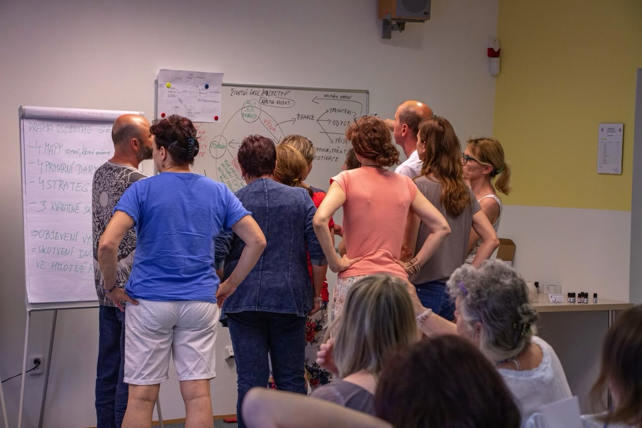 Kontinuální iniciační a transformační proces, s on-line podpůrným skupinovým setkáním po každém workshopu a uzavřenou FB skupinou. Bezpečné prostředí a skupinová dynamika stejně naladěných lidí.